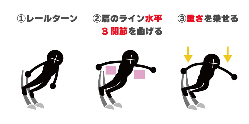 具体的には、①体を下側に落下させていく動き、②低い姿勢でスキーを押さえる動き、③立ち上がる動きが必要になってきます。